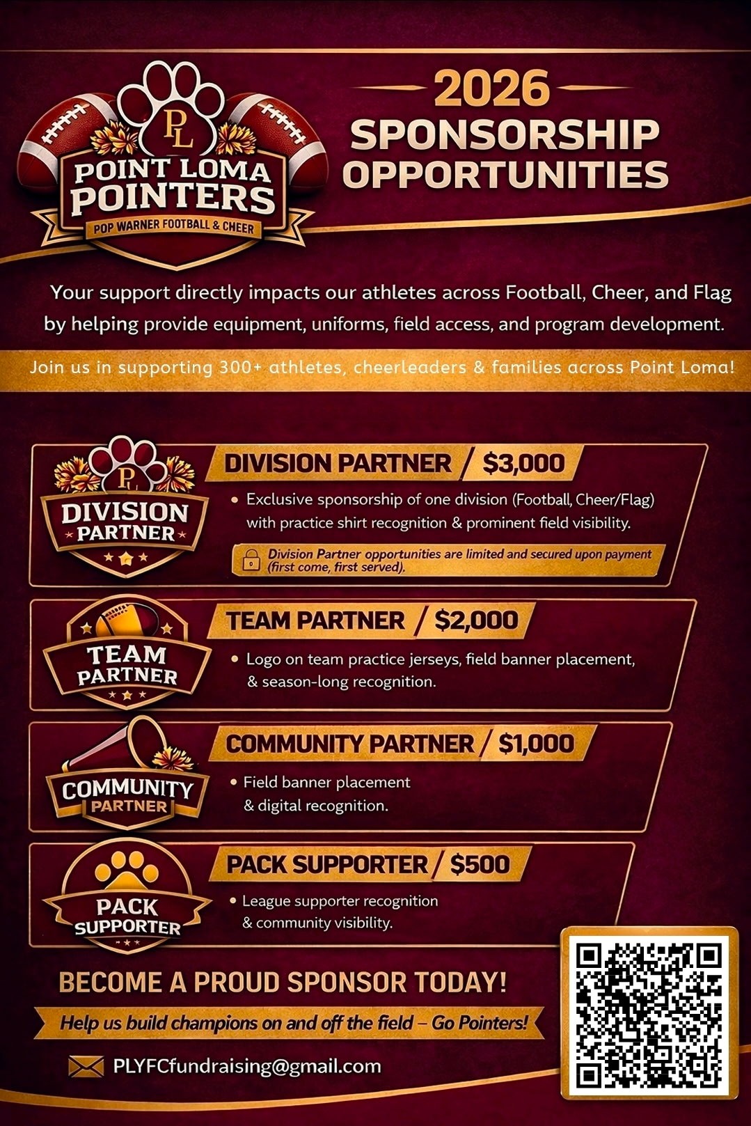 Thank you for your interest in supporting Point Loma Youth Football & Cheer (PLYFC). Your sponsorship helps provide valuable resources for our athletes, including equipment, uniforms, and field rentals, while promoting community engagement and youth development. Below are our sponsorship opportunities for the upcoming season: